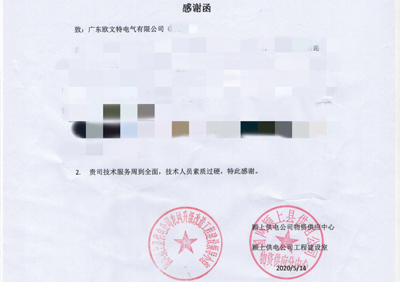 【喜讯】欧文特电气收到了国家电网的书面感谢函